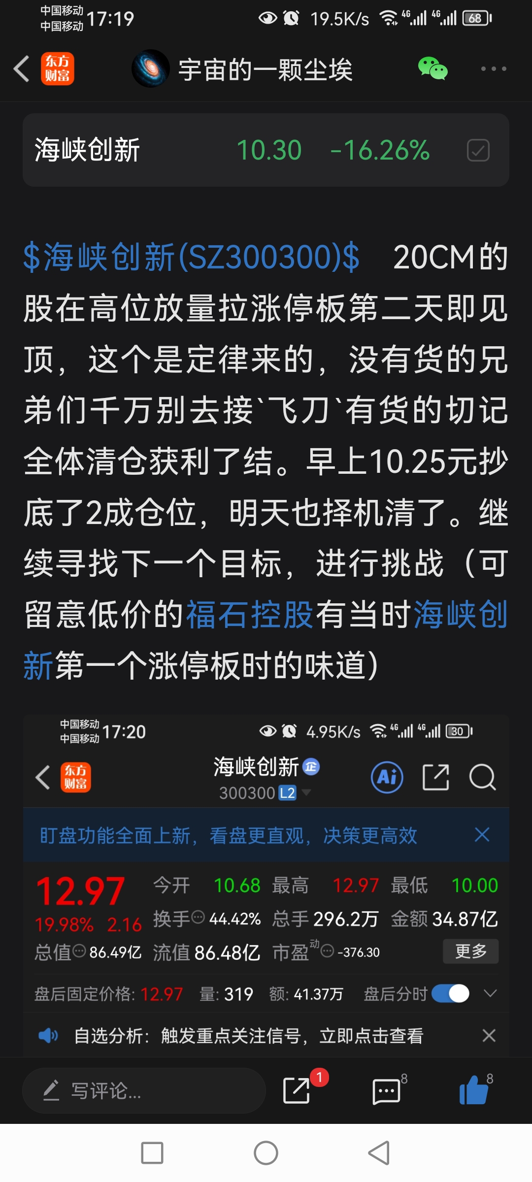 $海峡创新(SZ300300)$ 11月4日给你们预判的:高位放量封板第二天即见顶完全正确(12.48元13.30全体清仓)相信很多兄弟姐妹们都在高位兑现获利了结了。。。