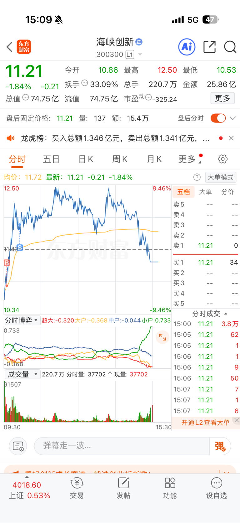 $海峡创新(SZ300300)$ 做了一块钱的t