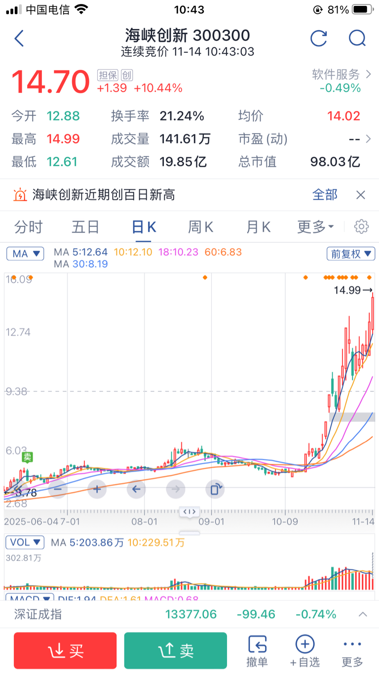 $海峡创新(SZ300300)$ 卖的太早了,后面一直不敢买