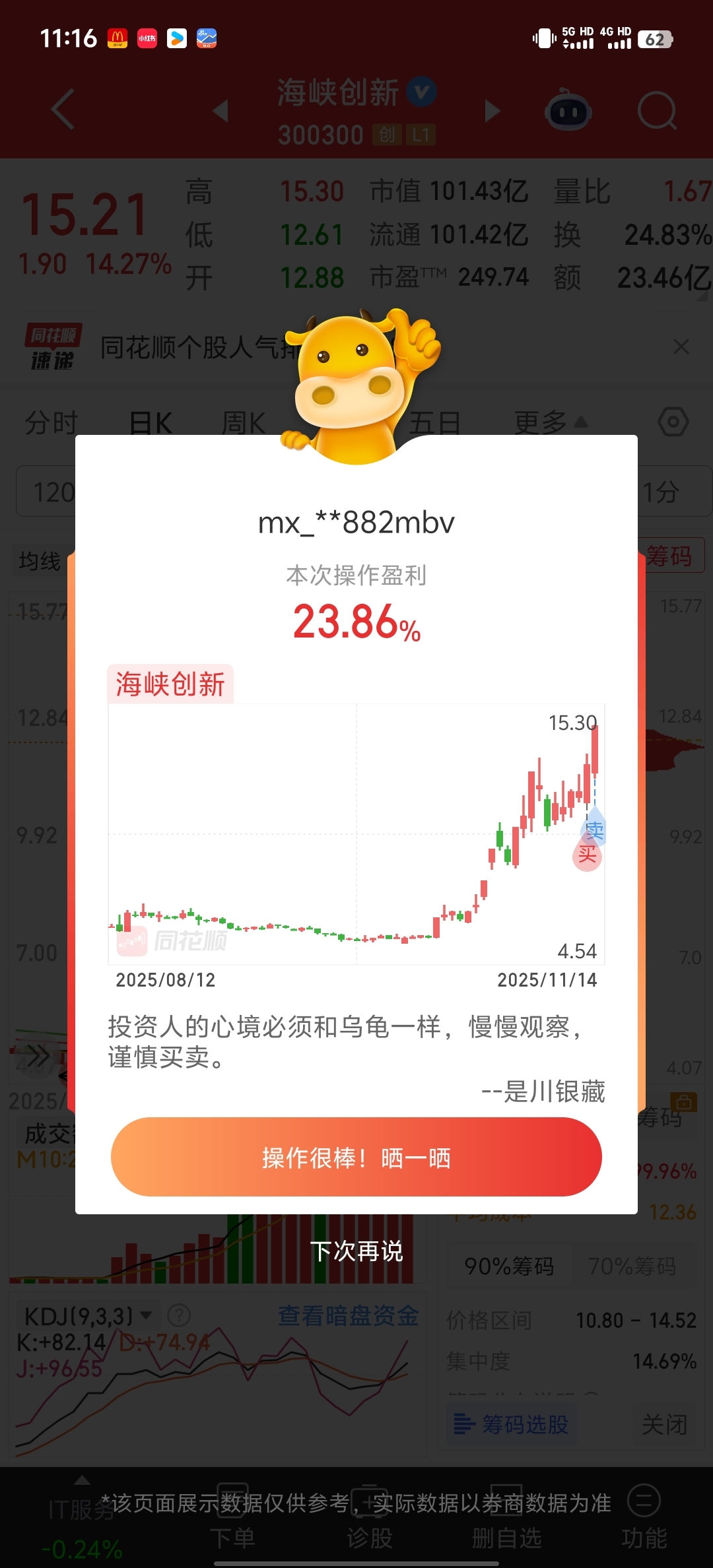 $海峡创新(SZ300300)$ 该强势还横盘,走了,简单吃点