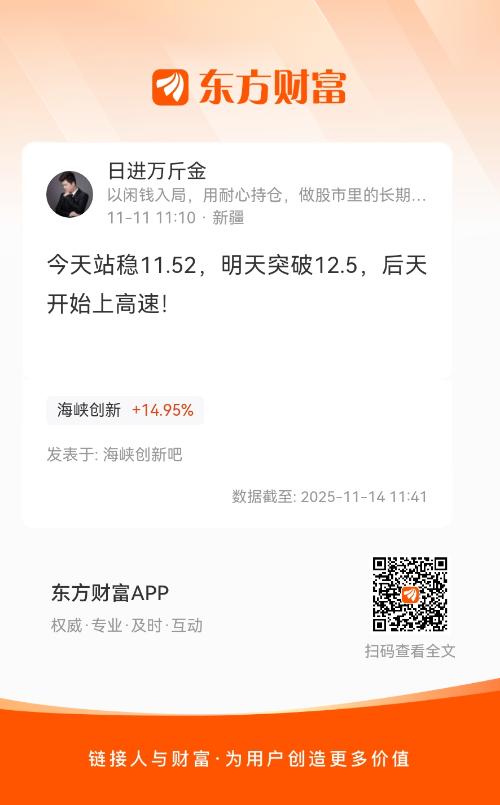 今天站稳11.52,明天突破12.5,后天开始上高速!