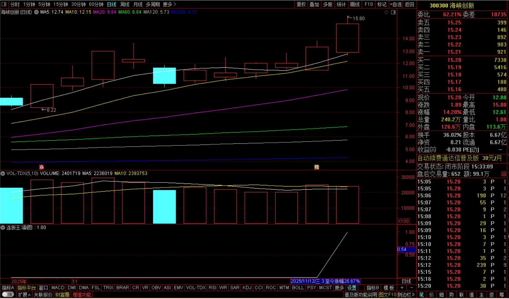 $海峡创新(SZ300300)$ 龙抬头连板王战法,301201诚达药业,300584海辰药业和300300海峡创新一开盘就被连板王捕捉到了,前两只票当天都走出了涨停板!300300海峡创新也大涨14.20%!