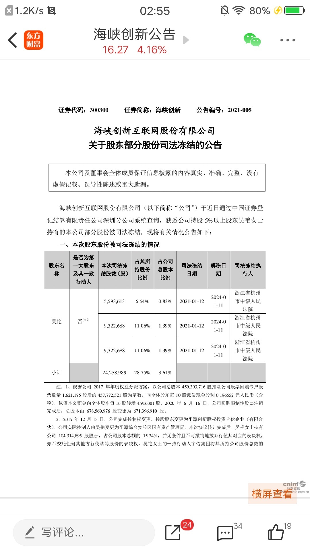 $海峡创新(SZ300300)$ 这家伙2021一月份也被冻结了