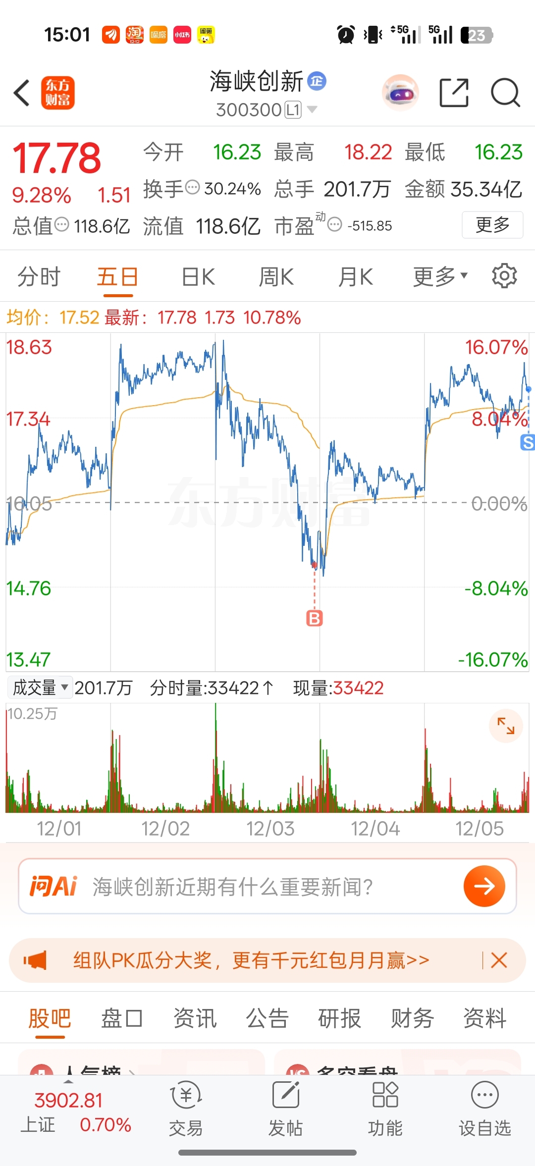 兄弟们,2天赚了17个点,我先落袋为安了,祝海峡创新再创新高。