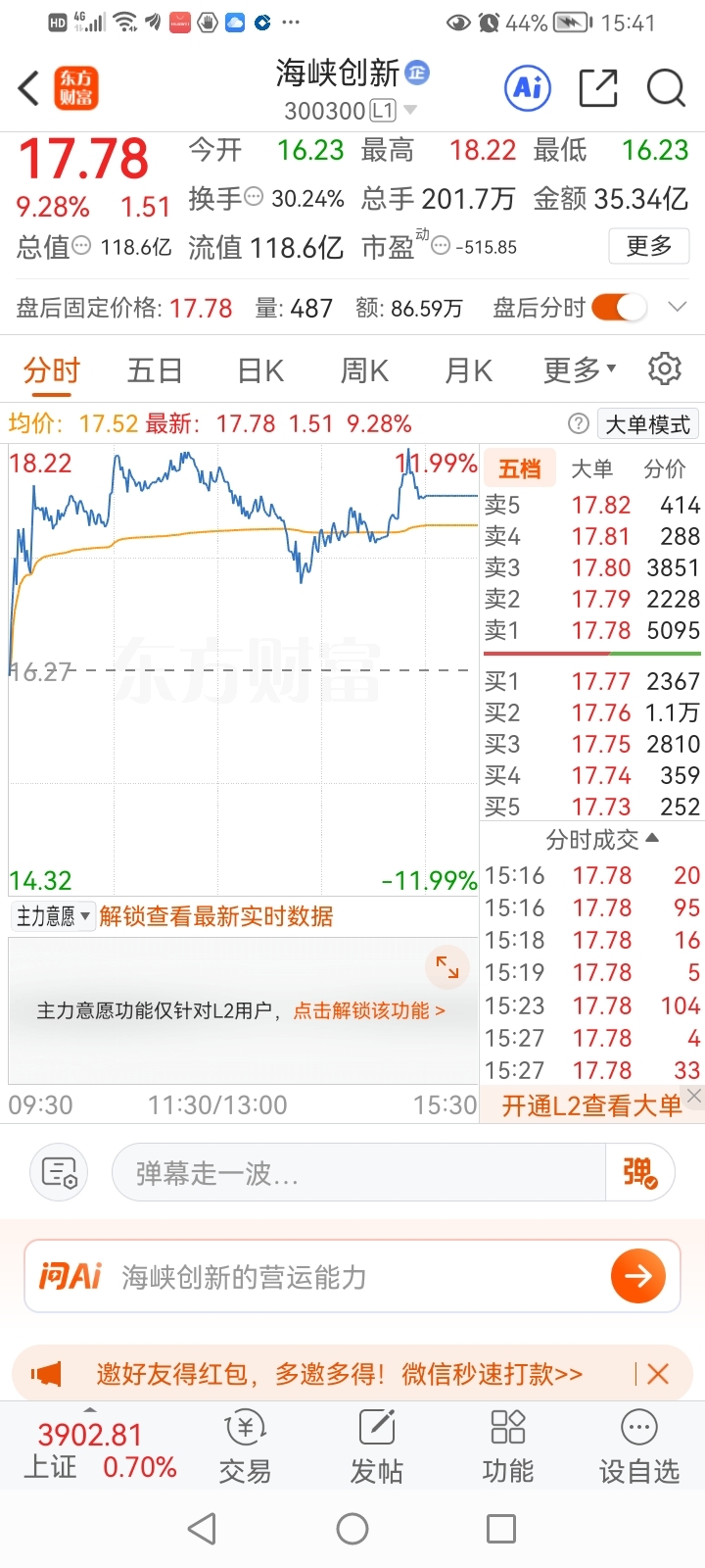 $海峡创新(SZ300300)$ 怎么15:27了还在成交?