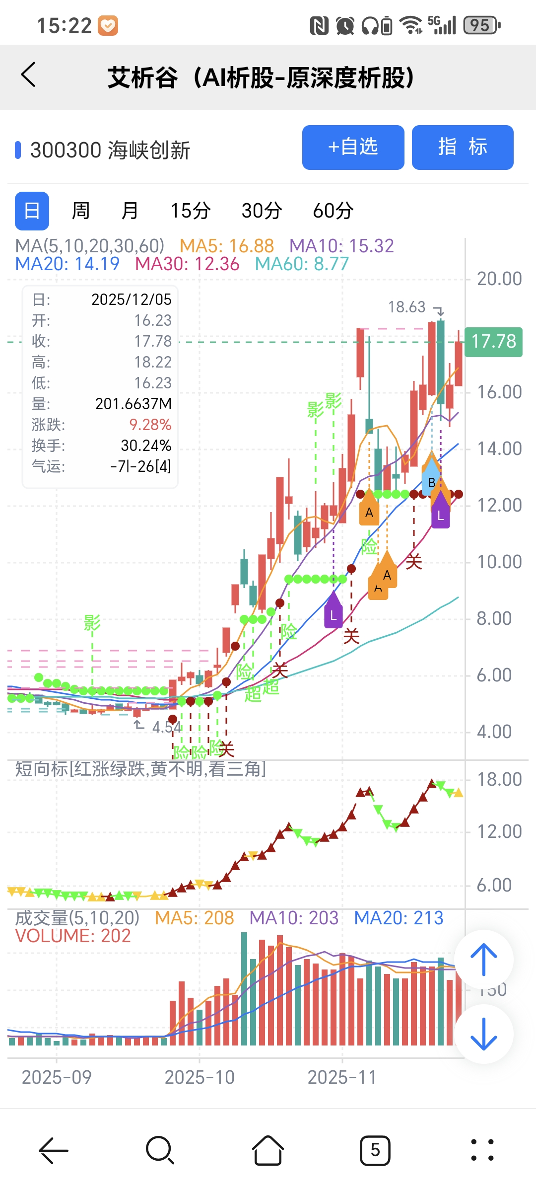 红绿小圆点是艾析谷的量化指标-超级短趋线,是趋势跟踪+突破类的量化指标,完全免费。