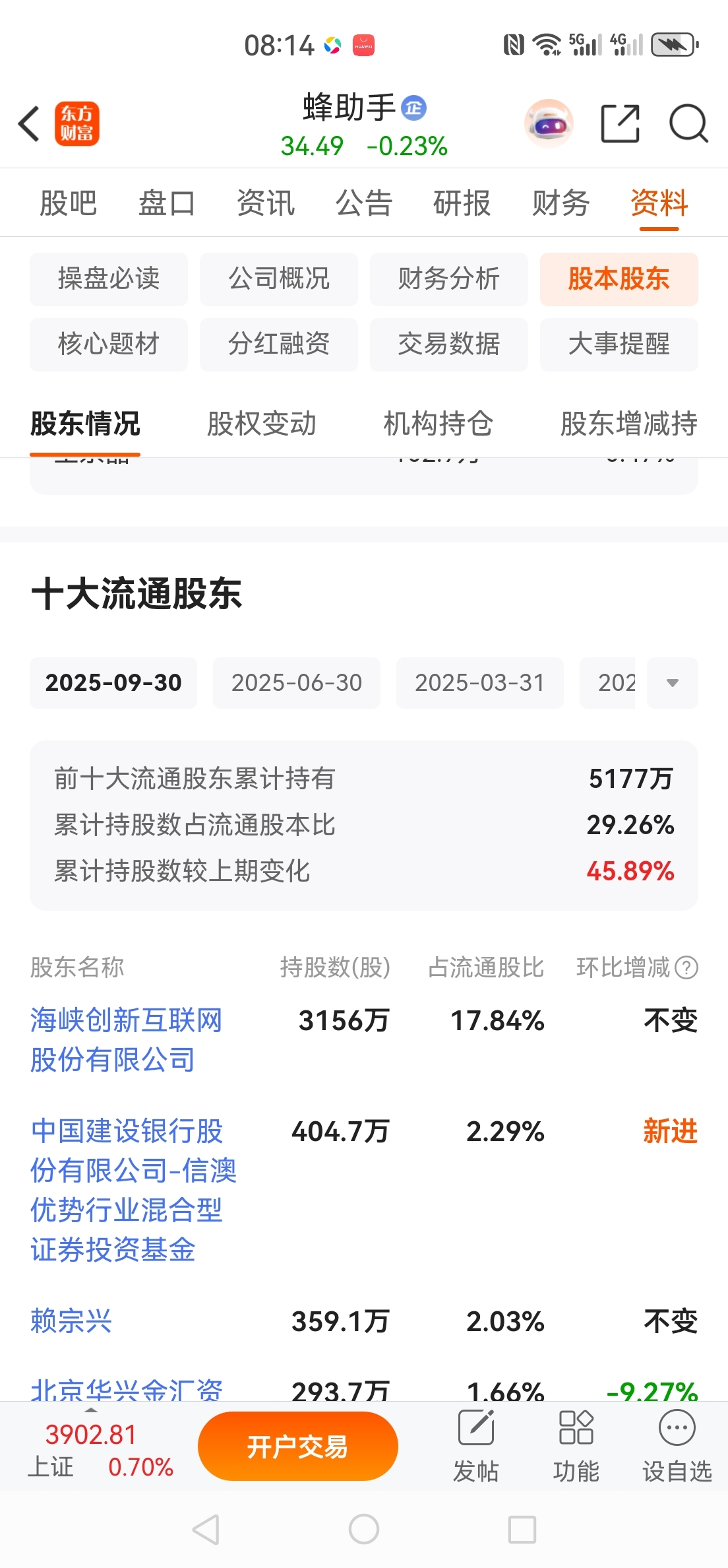 低调大气有内涵的海峡创新,是蜂助手第一大流通股股东,第二大股东。持股百分之十七点