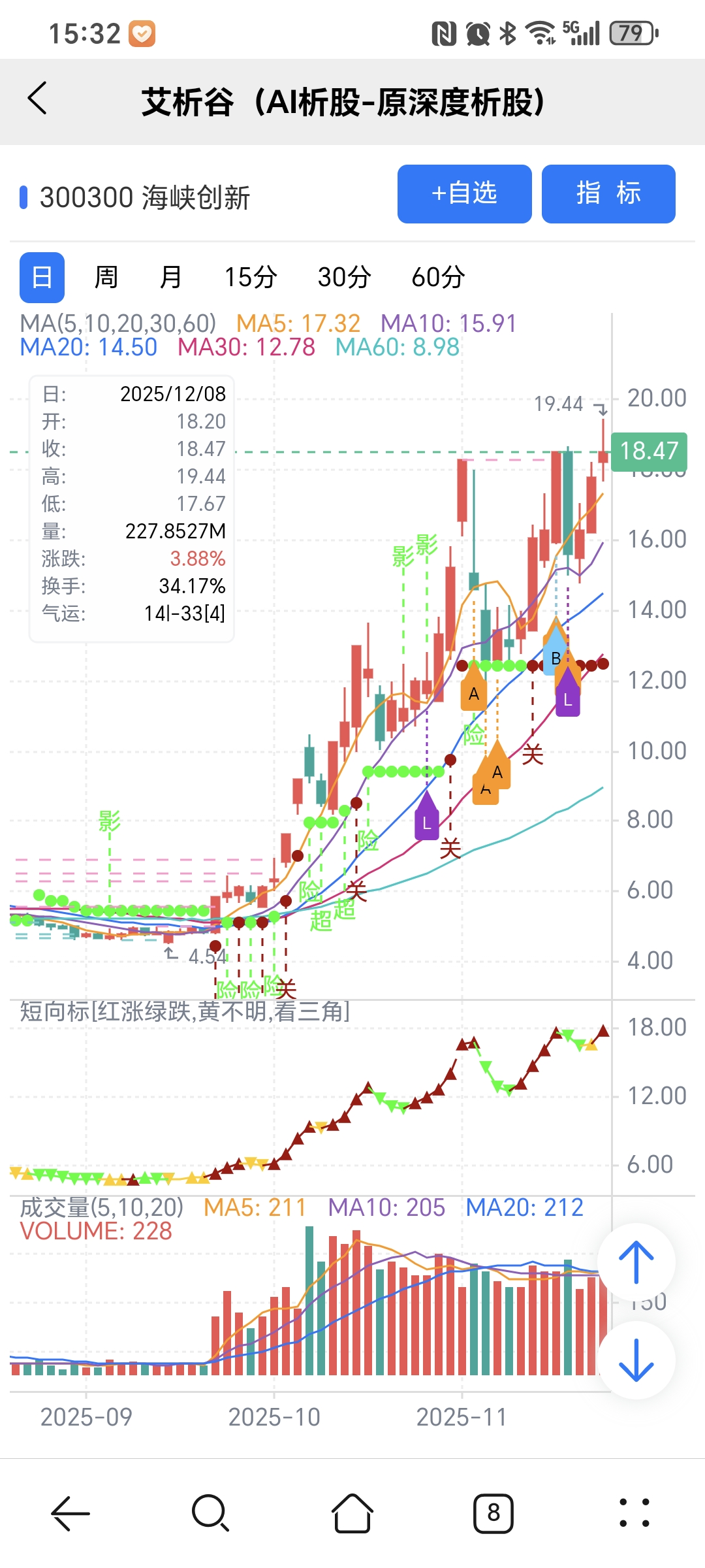 红绿小圆点是艾析谷的量化指标-超级短趋线,是趋势跟踪+突破类的量化指标,完全免费。