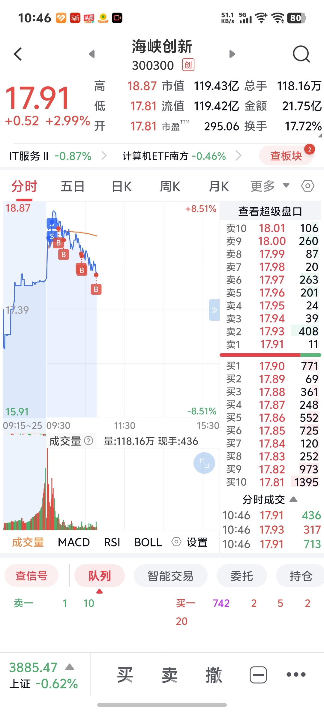 $海峡创新(SZ300300)$ 17.9补仓完毕,今天早盘操作告一段落