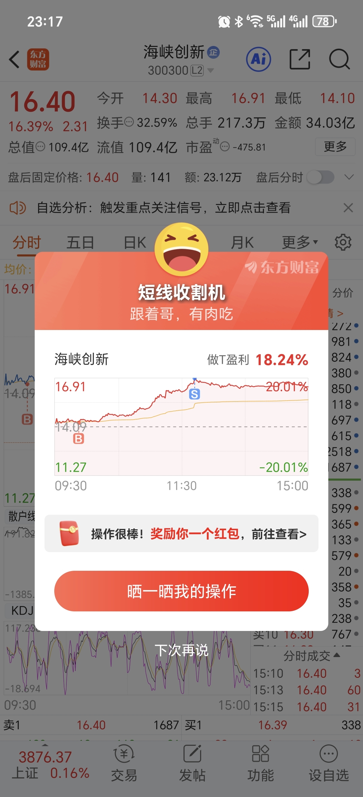 $海峡创新(SZ300300)$ 昨天涨那么多知足了今天开盘价清仓了,非常感谢拉升的,以下图是昨天最完美的T。