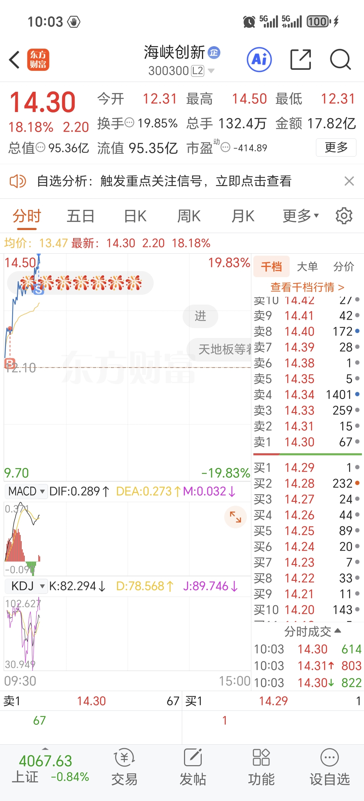 $海峡创新(SZ300300)$ 从去年12月17块多买入你后就天天跌受够了你的折磨中间T了N次的错曾经把成本拉得更高了,终于等到你昨天开始重仓了你了,今天好不容易大涨早上又再次加了点仓到14.50卖掉了,今天终于把这个T对了一次把成本T到了12块多,也从大亏损到小赚了非常感谢主力的拉升