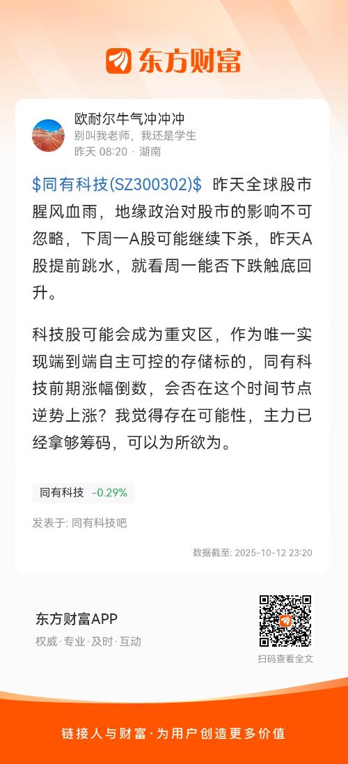 $同有科技(SZ300302)$ 昨天全球股市腥风血雨,地缘政治对股市的影响不可忽略,下周一A股可能继续下杀,昨天A股提前跳水,就看周一能否下跌触底回升。