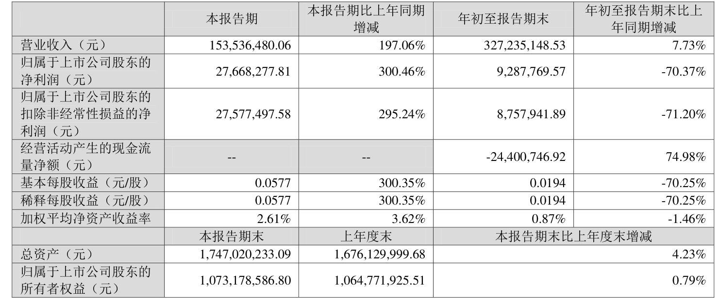 中证智能财讯同有科技(300302)10月20日披露2025年第三季度报告。前三季度公司实现营业总收入3.27亿元,同比增长7.73%;归母净利润928.78万元,同比下降70.37%;扣非净利润875.79万元,同比下降71.20%;经营活动产生的现金流量净额为-2440.07万元,上年同期为-9751万元;报告期内,同有科技基本每股收益为0.0194元,加权平均净资产收益率为0.87%。