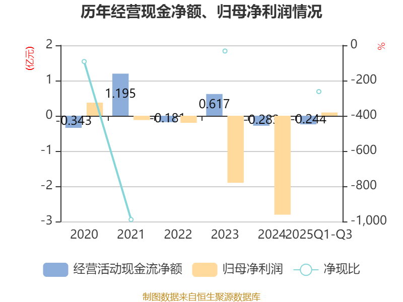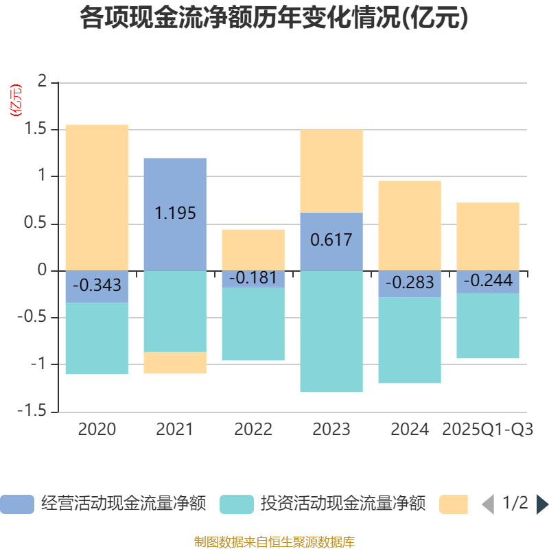 2025年前三季度,公司经营活动现金流净额为-2440.07万元,同比增加7310.92万元;筹资活动现金流净额7229.48万元,同比减少2086.57万元;投资活动现金流净额-6876.83万元,上年同期为-8241.17万元。