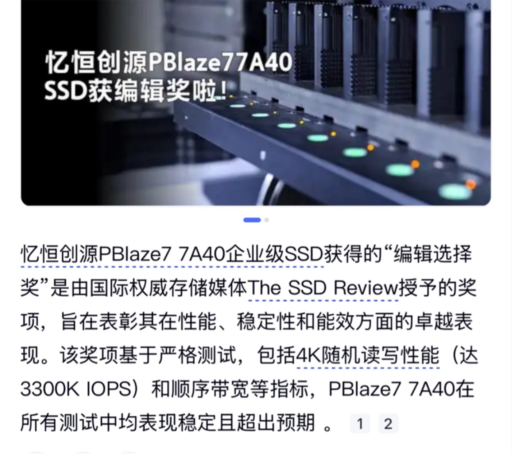 忆恒创源PBlaze77A40企业级SSD赢得媒体TheSSDReview授予的