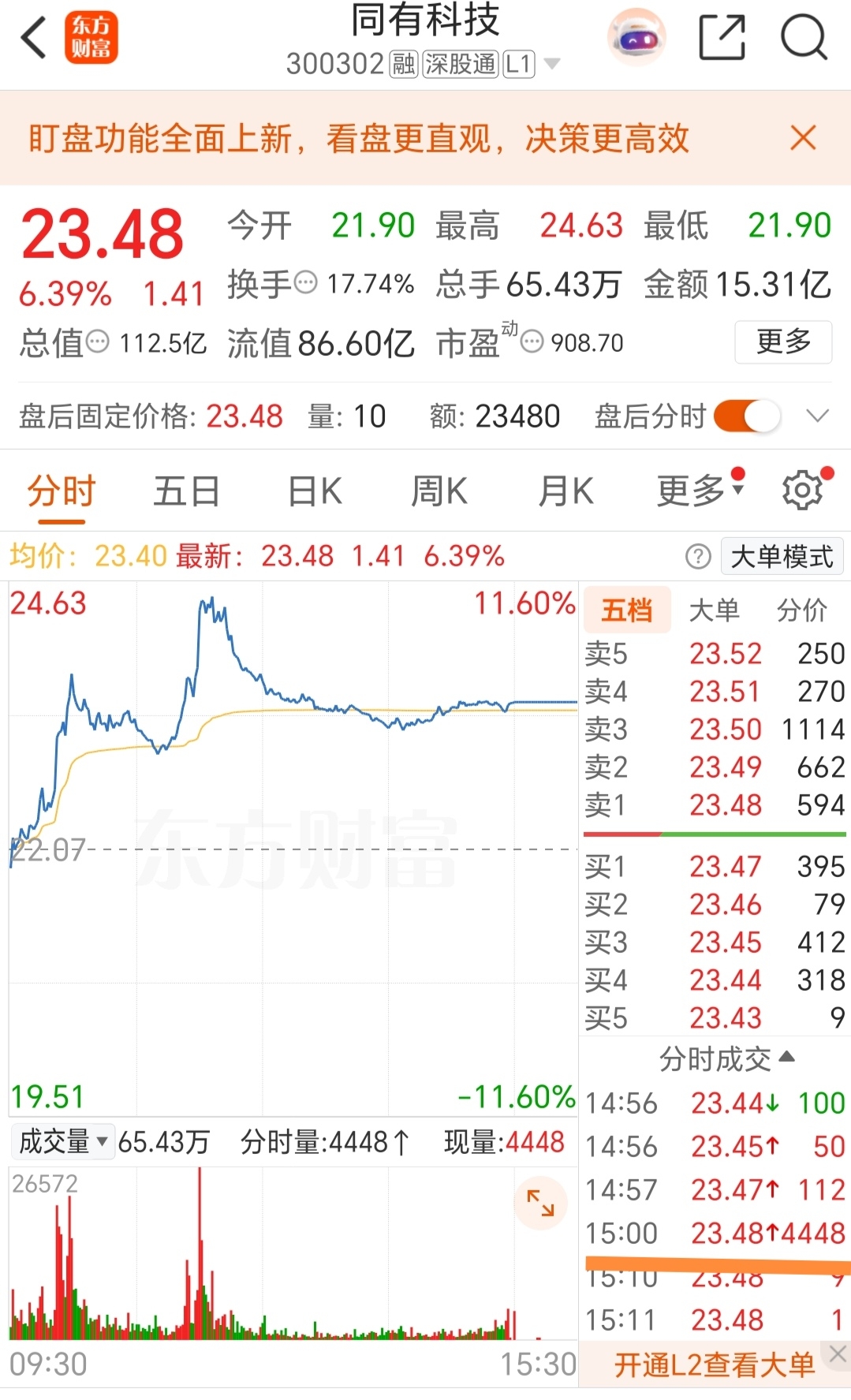 $同有科技(SZ300302)$ 大单!集合竞价成交了一笔大单4448手,有点牛x。