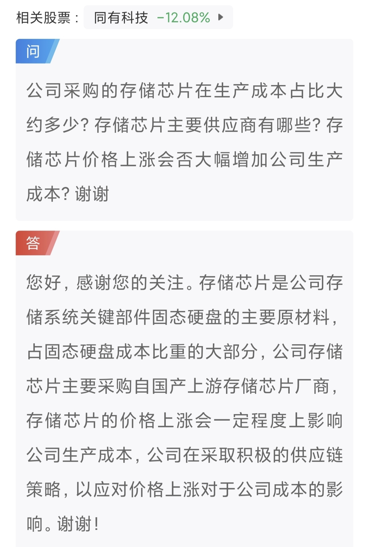 $同有科技(SZ300302)$ 芯片涨价提高成本。对于组装厂都是利空。大意了。难怪这么跌。