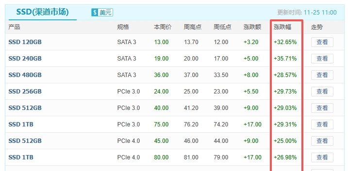 存储市场涨价还在继续。据CFM闪存市场最新数据,截至11月25日,渠道市场数据显