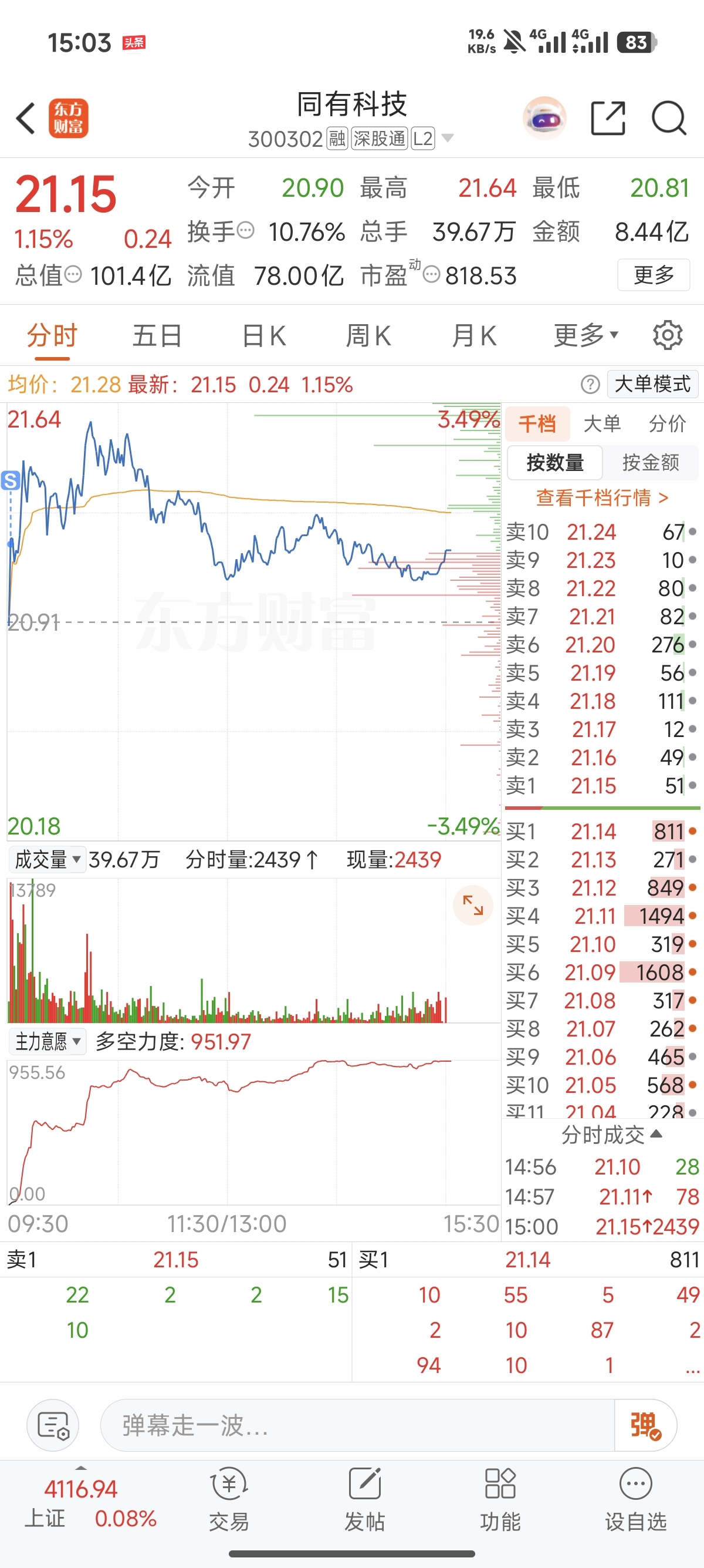 $同有科技(SZ300302)$ 卖早了,还没接回来