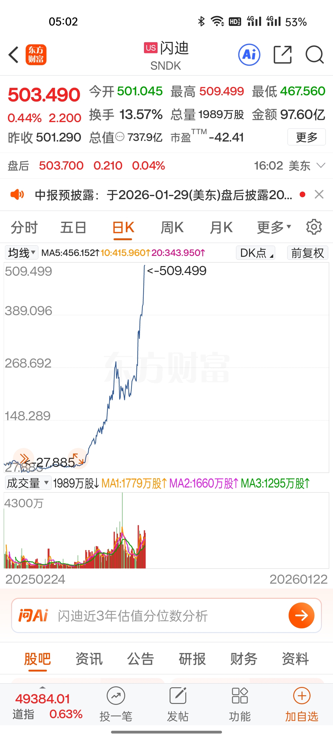 闪迪今年从27美元涨到505美元,主力大开,净赚快20倍,同有科技主力与大家拼命做为几分钱差价,这能赚多少碎银?