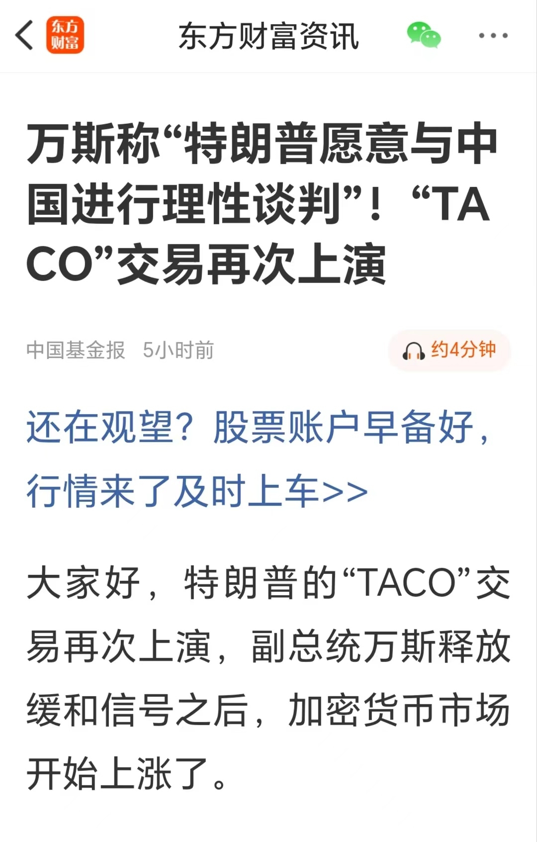 万斯说话了,说特朗普愿意和我们理性谈判。加密货币加速反弹,美三大期指全部上涨。