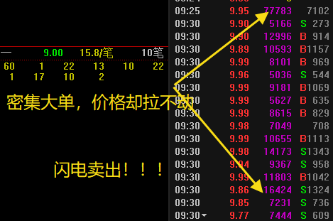 2:开盘一分钟内要紧盯盘口,超级大单出没,但价格却拉不上去,这种就是即将走衰的暗示。