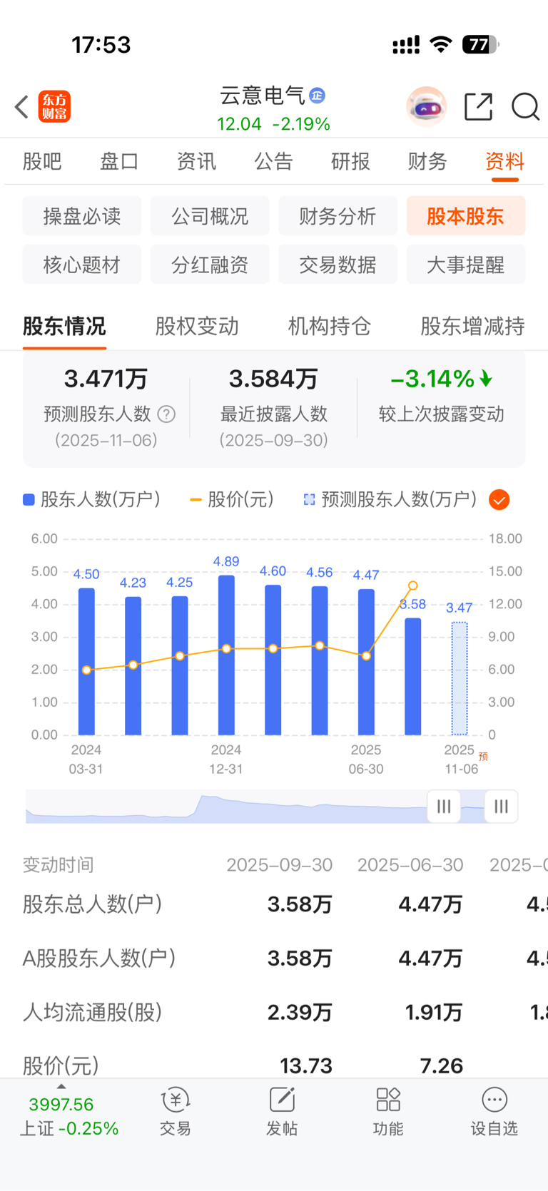 $云意电气(SZ300304)$ $平潭发展(SZ000592)$ $三花智控(SZ002050)$ 云意电气截止11月6日股东人数创2017年以来新低,有多少散户交出筹码。