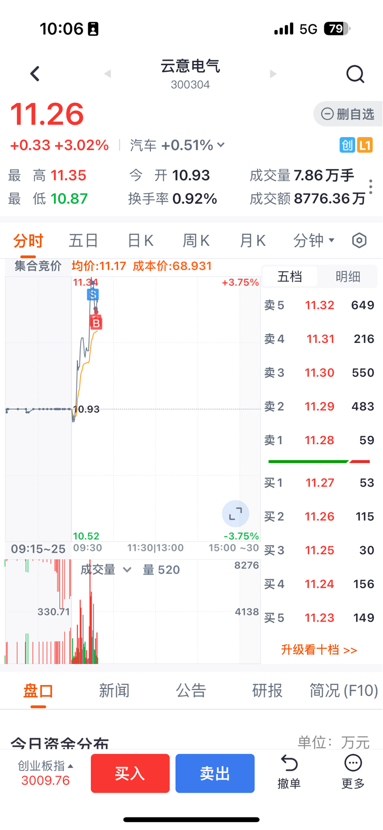 $云意电气(SZ300304)$ 11月25日 今天上午没有忍住又 T 了你一下。今天的收盘价与高价有2毛5的价差,还是可以 T 的,主力现在不会走出单边行情的。只有这样,成交量占一部分,就好看了。