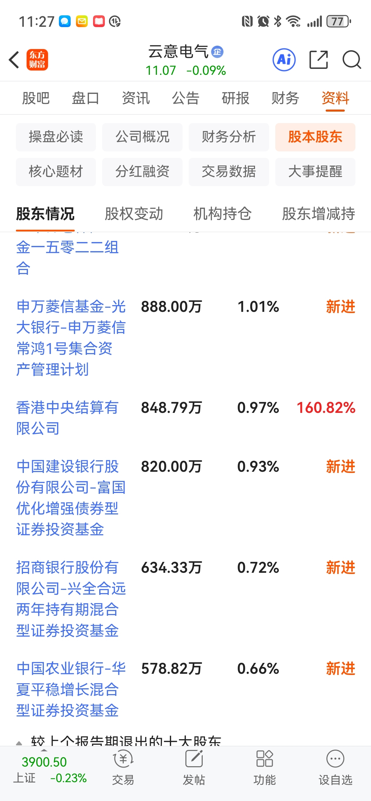 $云意电气(SZ300304)$ 这只股票很神奇,股东股本里到2025年9月,显示全部是新进增持的机构,社保基金。但是股价只是7元涨到15元就一路下跌到11元,机构基金扎堆只是涨一倍,又那么多的概念存在的股票……看不懂,近期趋势还在往10元奔去。也许你四季度的股东股本才会真正体现机构的持仓情况,现在还不敢建仓。