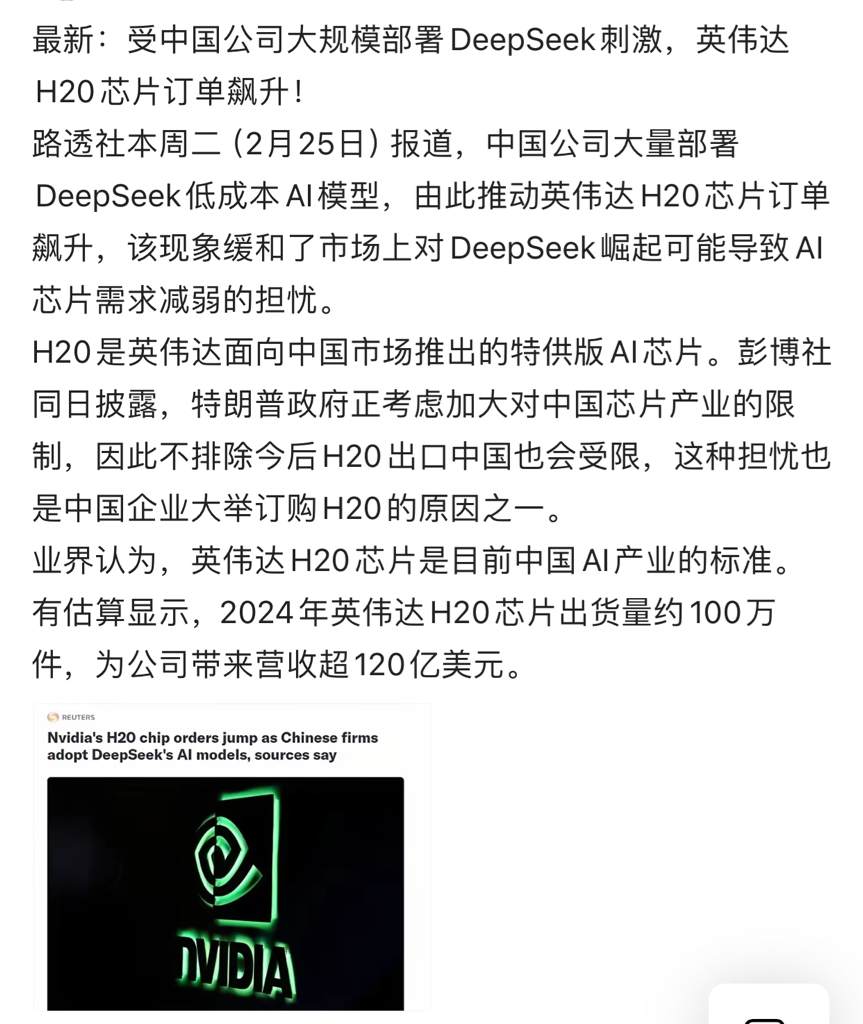 受中国公司大规模部署DeepSeek刺激,英伟达H20芯片订单飙升!