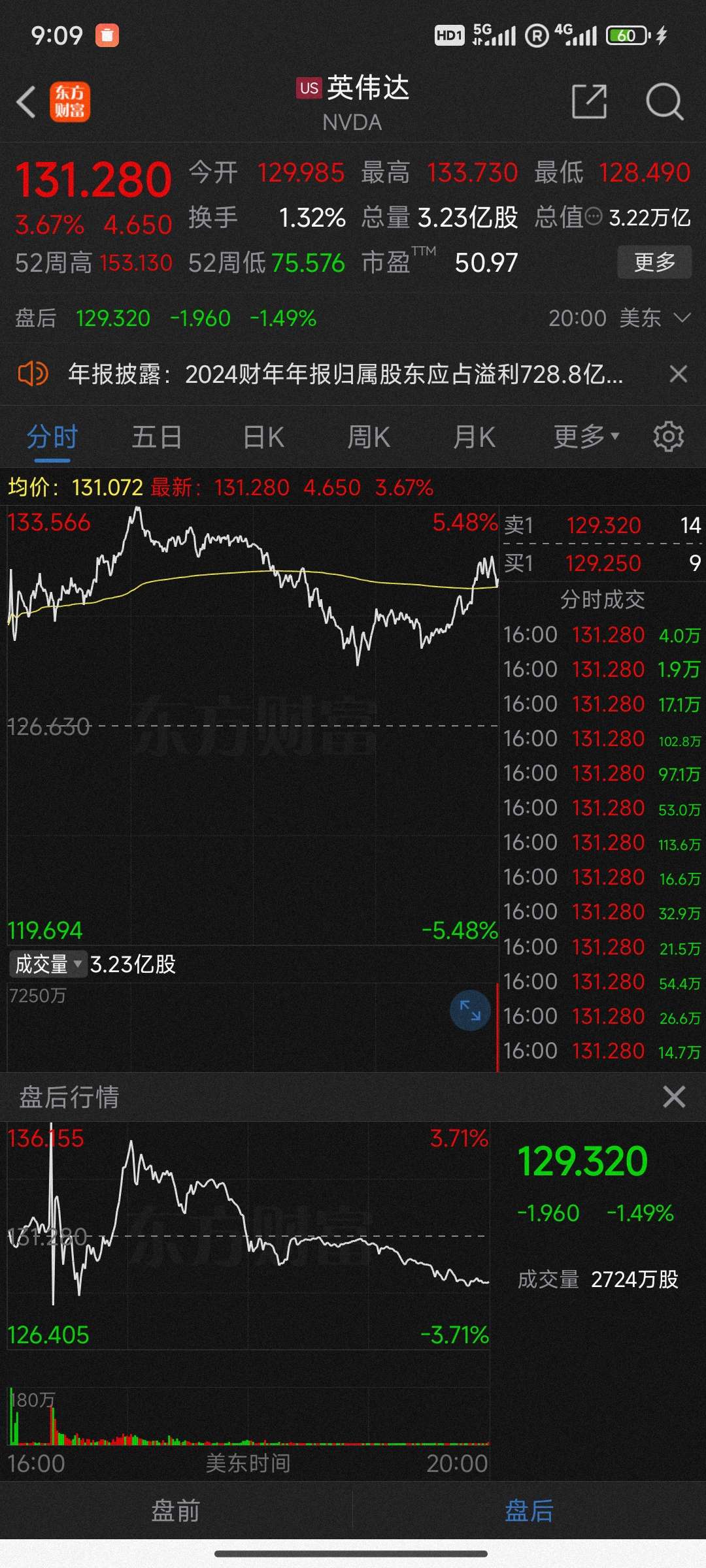 达子盘中涨3.67%,盘后跌1.49%