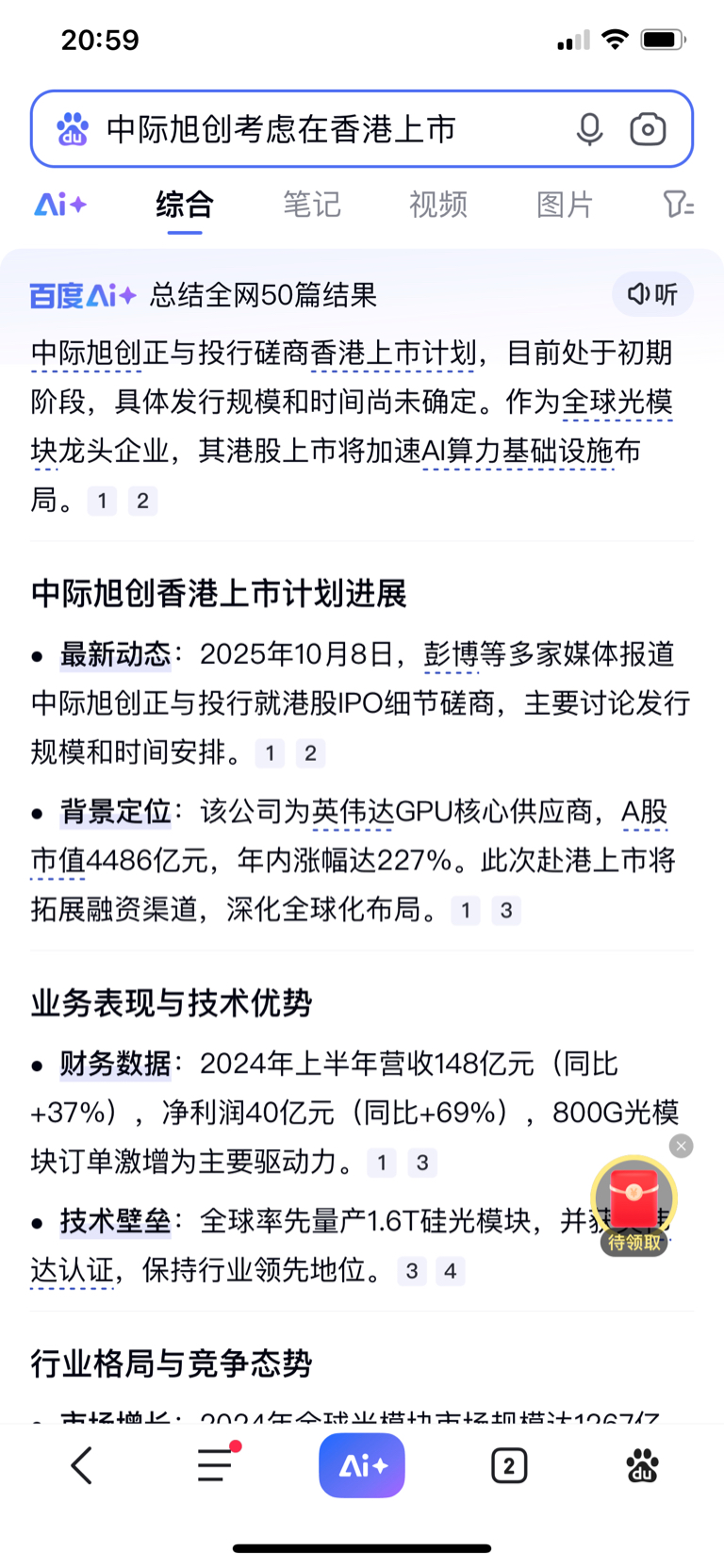 最新动态:2025年10月8日,彭博等多家媒体报道中际旭创正与投行就港股IPO细节磋商,主要讨论发行规模和时间安排。12