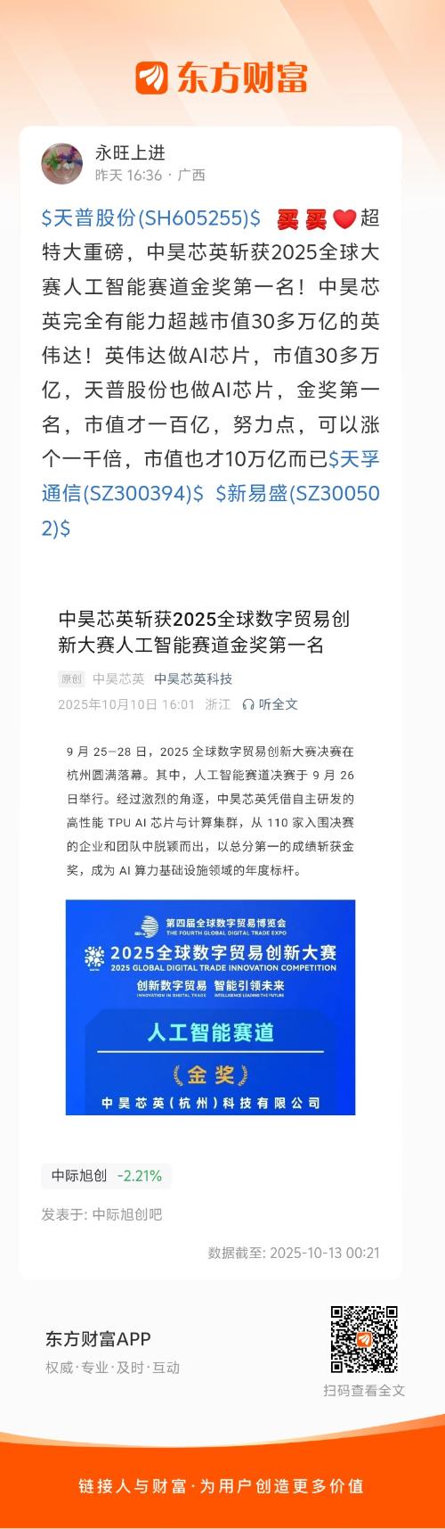 $天普股份(SH605255)$ 超特大重磅,中昊芯英斩获2025全球大赛人工智能赛道金奖第一名!中昊芯英完全有能力超越市值30多万亿的英伟达!英伟达做AI芯片,市值30多万亿,天普股份也做AI芯片,金奖第一名,市值才一百亿,努力点,可以涨个一千倍,市值也才10万亿而已$天孚通信(SZ300394)$ $新易盛(SZ300502)$