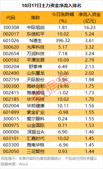 此外,还有N道生、光库科技、万润科技和平潭发展等个股主力资金净流入居前,分别为3.61亿元、3.32亿元、3.24亿元和2.79亿元。