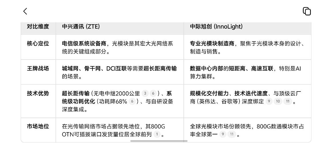 发了一下中际旭创的泡沫程度作提醒,本意并不是想把中际旭创和中兴通讯做对比,二者现阶段也不是能简单类比的企业。不存想遭到地下一众恶评,不去深入研究的话真不适合做投资。就光模块来讲只是通信领域一个细微构造,下面一图可以详细说明清楚,中兴通讯相当于作高速公路、高架立交、桥梁、隧道!中际旭创相当于做的是乡道、县道、村道!他俩在业务竞争上目前来看当然是没有的,就好比你让中铁去修乡道一样,他会会去修吗?当然不会!二者从体量、研发投入、营业收入上完全不是一个量级。当然如果你说市值的话中际旭创相当于两个中兴通讯,但是论技术实力中兴通讯相当于一千个中际旭创,这就是机构喜欢的泡沫,最终交给底下一众散户接盘!