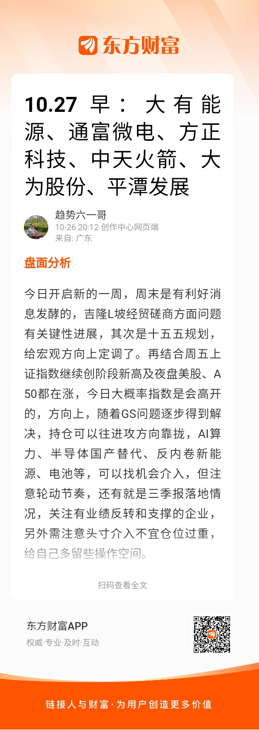 今日开启新的一周,周末是有利好消息发酵的,吉隆L坡经贸磋商方面问题有关键性进展,其次是十五五规划,给宏观方向上定调了。再结合周五上证指数继续创阶段新高及夜盘美股、A50都在涨,今日大概率指数是会高开的,方向上,随着GS问题逐步得到解决,持仓可以往进攻方向靠拢,AI算力、半导体国产替代、反内卷新能源、电池等,可以找机会介入,但注意轮动节奏,还有就是三季报落地情况,关注有业绩反转和支撑的企业,另外需注意头寸介入不宜仓位过重,给自己多留些操作空间。