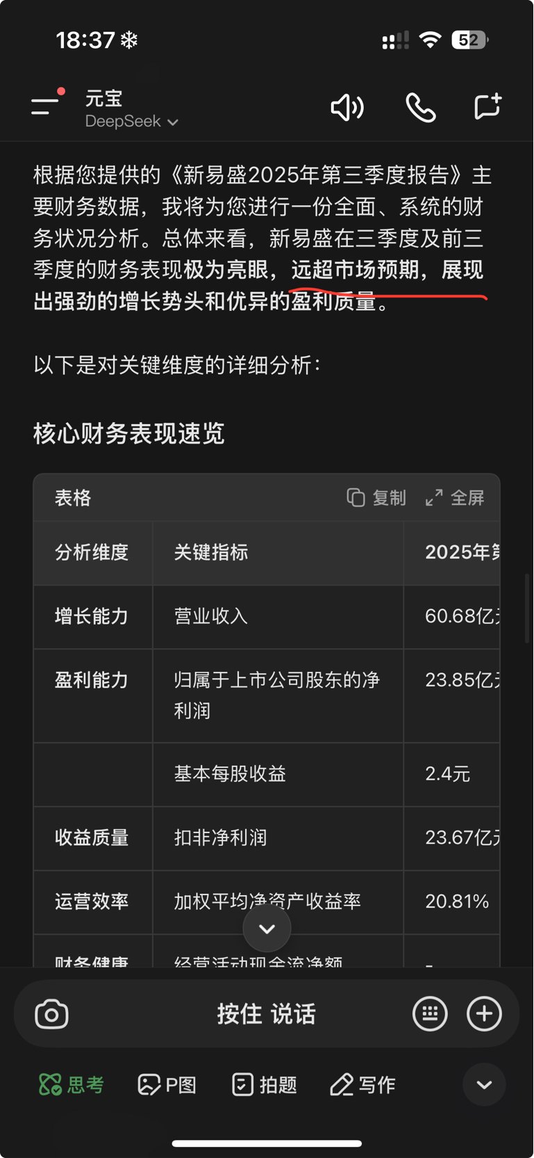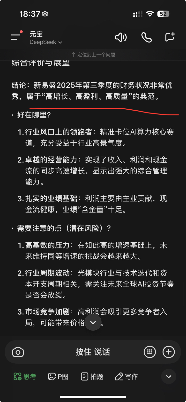 $中际旭创(SZ300308)$ 这里再说 新易盛不及预期的,写大堆小作文, 这种人大家真的可以拉黑。 写小作文的大概率 枪手。 只是单纯喊的 新易盛 不及预期 啥的 不是蠢就是 看不懂 财报。 那么我就用 DeepSeek 的分析截图给你们看。
