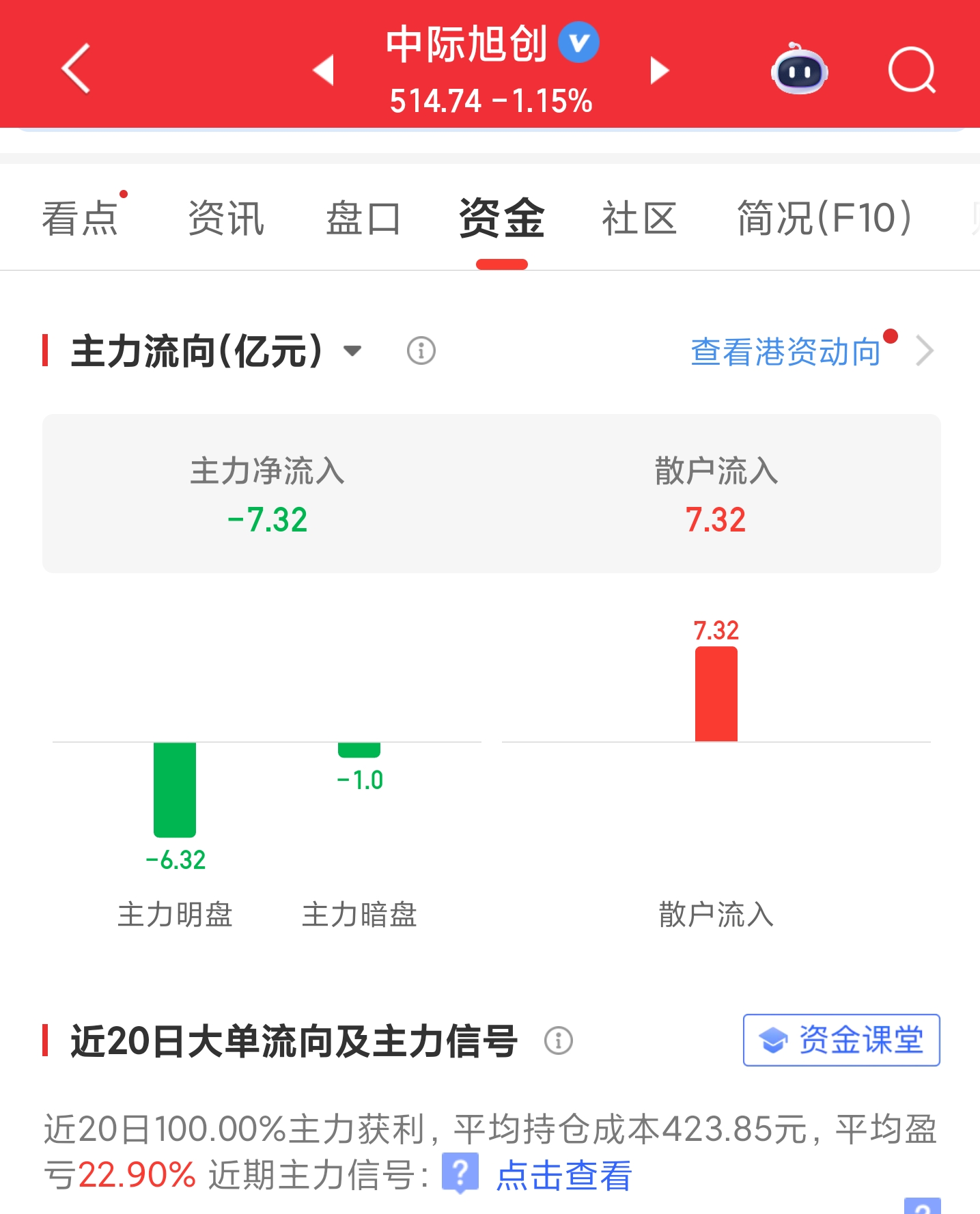 $中际旭创(SZ300308)$ 止盈位为520.72,走势有疲软迹象,当前压力不小;尾盘资金跑了5个亿!