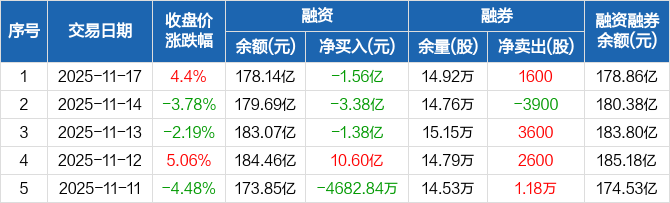 中际旭创:融资净偿还1.56亿元,两市排名第11(11-17)