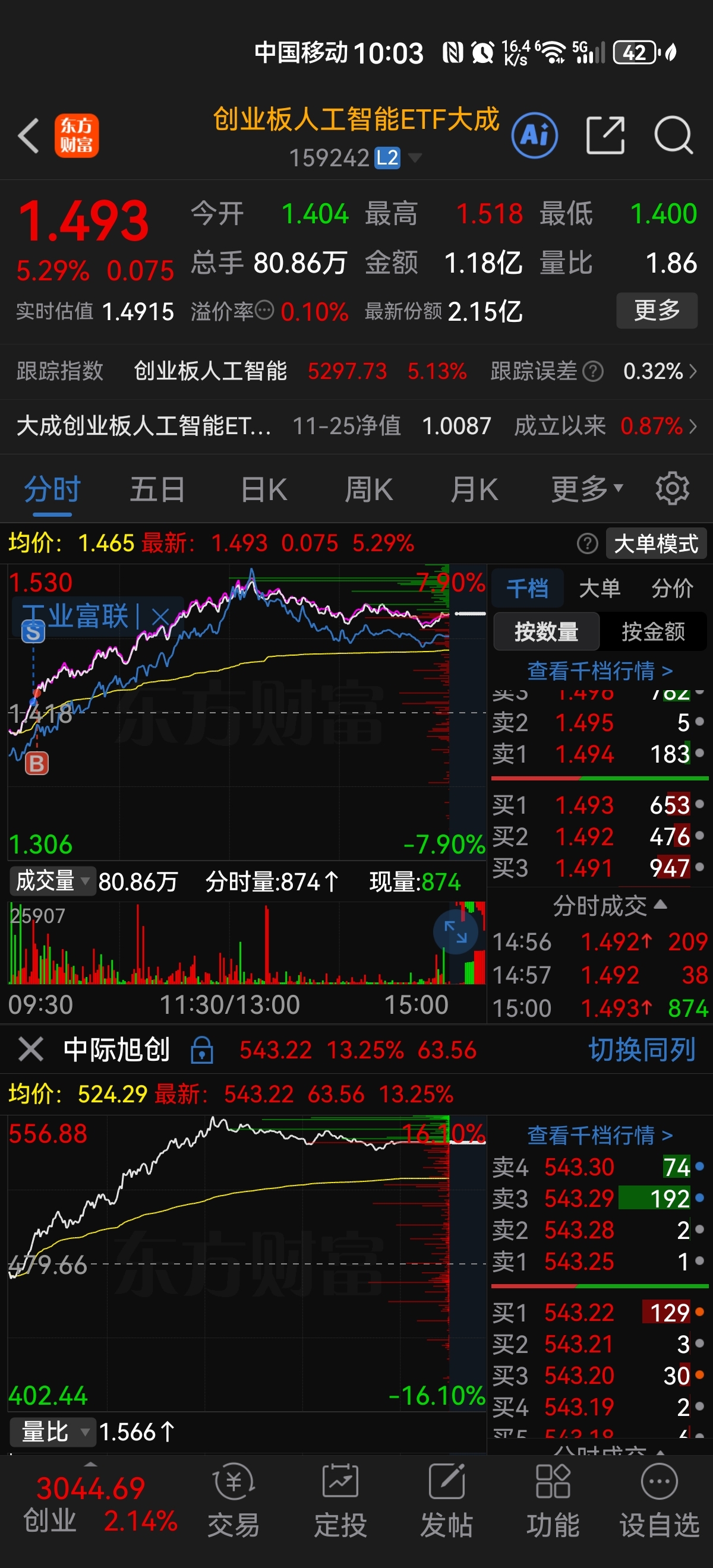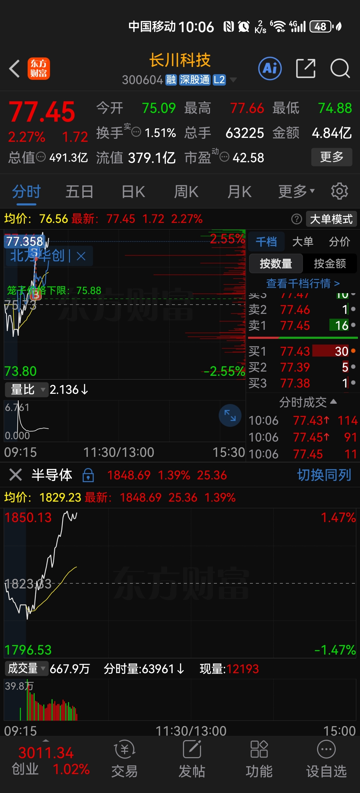 今天卖了就拉,一看大哥中际旭创大涨赶紧挂高一个点追回来了可惜买的长川科技不涨没有