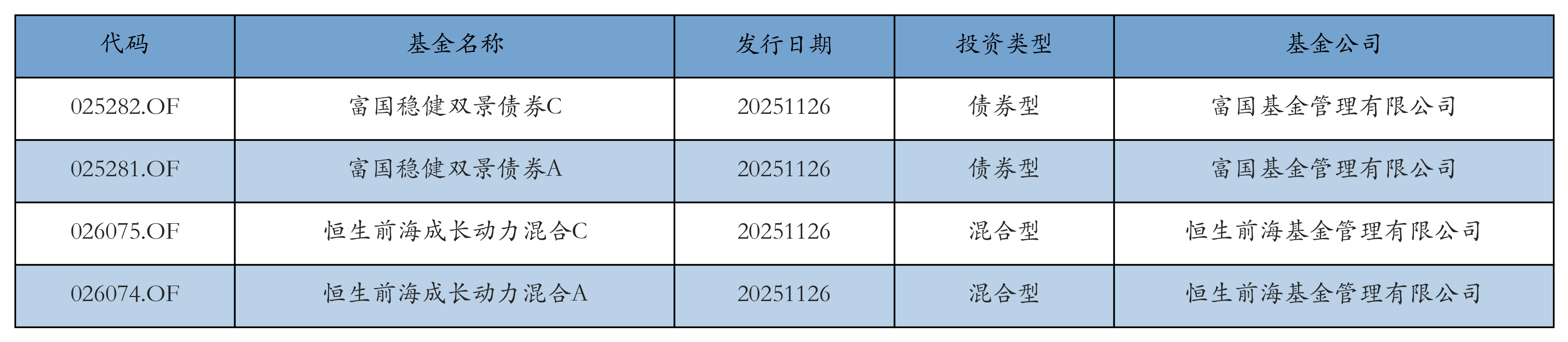 昨日有4只新基金发行,分别为:富国稳健双景债券C、富国稳健双景债券A、恒生前海成长动力混合C、恒生前海成长动力混合A,详情见下表: