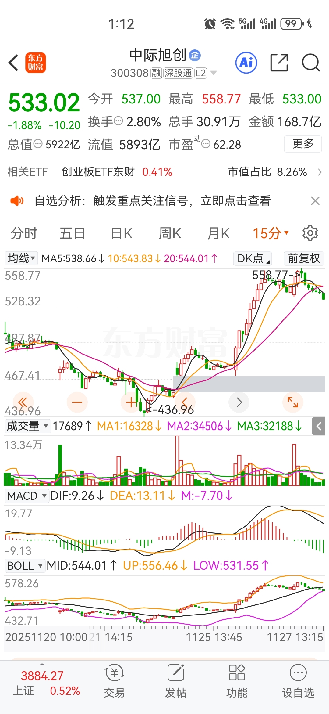 $中际旭创(SZ300308)$ 又一个短线(15分钟)级别的顶背离调整。这个时间不会超过2天,幅度不会打大。大资金可以忽略。