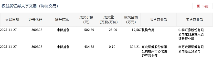 中际旭创今日大宗交易成交25.7万股,成交额1.29亿元