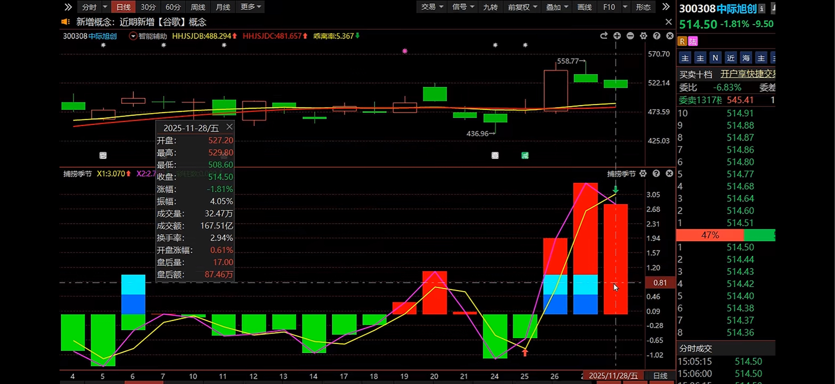 $中际旭创(SZ300308)$ 高位死叉下跌趋势,但因为三方主力资金还在所以可以认为是主力和游资的高度控盘,目前只是一个洗盘阶段。