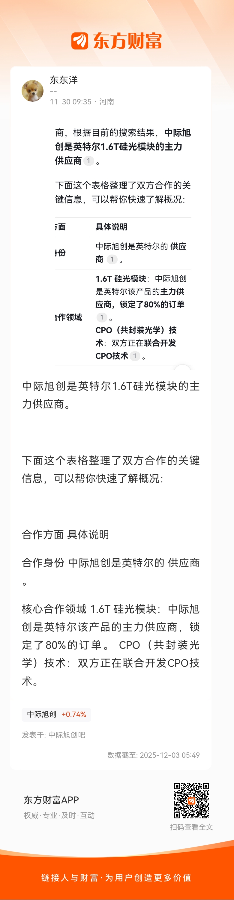 核心合作领域 1.6T 硅光模块:中际旭创是英特尔该产品的主力供应商,锁定了80%的订单。 CPO(共封装光学)技术:双方正在联合开发CPO技术。