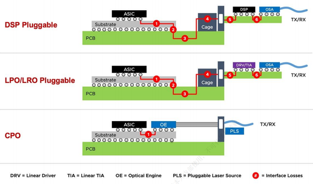 这项技术是光电共封装的直接竞争对手,最大优势是去掉了功耗“大户”DSP芯片,在成本和功耗上表现更优,且能利用现有技术生态快速量产。从业绩上来看,两种技术路线也在齐头并进。