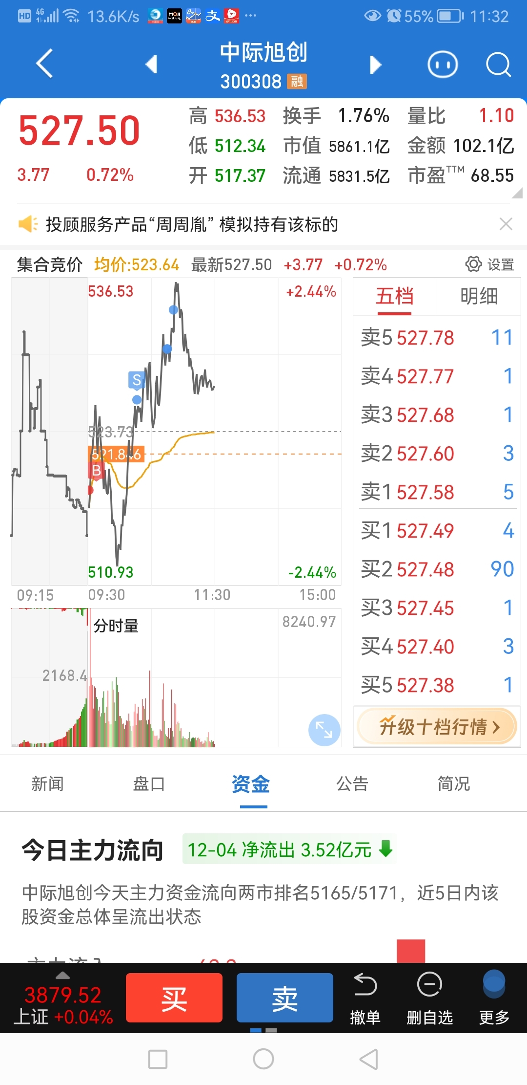 $中际旭创(SZ300308)$ 今天526.37出2手、530.66出2手、533.88出2手,成本降低6.65,留2手底仓明天做T