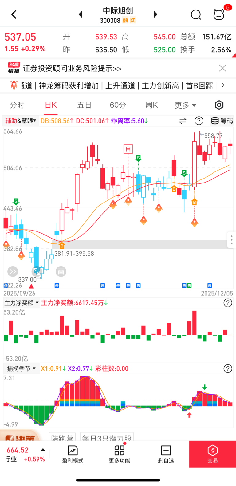 $中际旭创(SZ300308)$ 虽然资金净流出,但主力资金今天依然有6600万的净流入,短期已调整多日,趋势已开始平滑,买入线即将上穿卖出线,继续格局等待下周反弹。