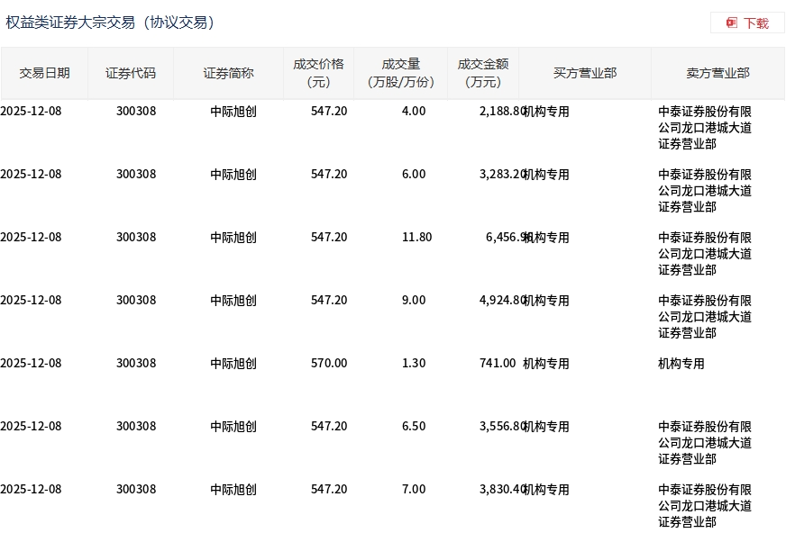 中际旭创今日大宗交易成交45.6万股 成交额2.5亿元