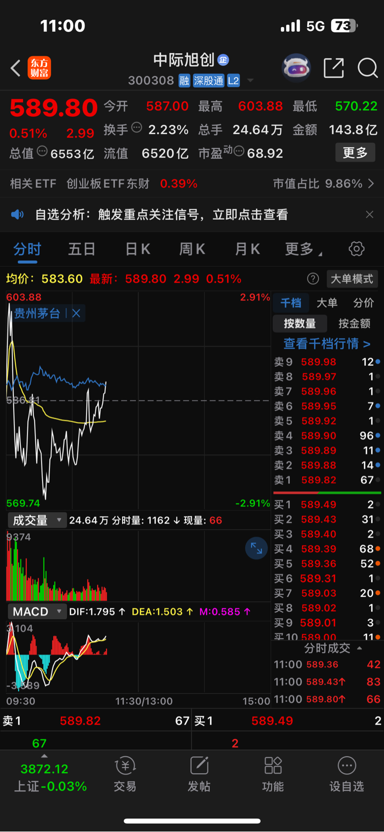 $中际旭创(SZ300308)$ 11:00准时突破茅台压制 一飞冲天